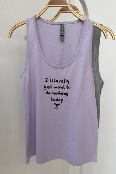 The slogan is finished in raised felt fabric lettering, adding a tactile, textured detail that stands out without being loud. Soft to the touch and slightly dimensional, it gives the tank a subtle point of interest while keeping the overall look casual and comfortable.